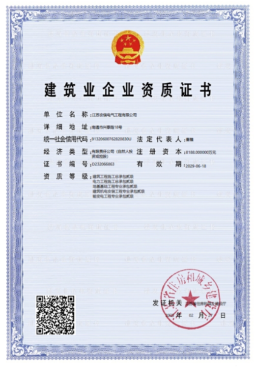 在創業之初,公司就堅持高起點的戰略思路,廣納賢才,集聚行業精英,創新發展,做優企業品牌?,F已取得:承裝二級、承修二級、承試二級,電力工程施工總承包二級,輸變電工程專業承包二級,建筑工程施工總承包二級,建筑機電安裝專業承包二級,地基基礎專業承包二級資質證書,并通過了質量、環境、職業健康和安全管理體系認證,確保各項工作有序管控。